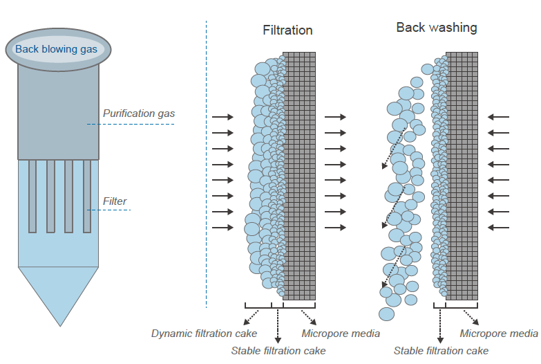 When the fluid is passing through filter cartridges, the solid particles will be retained on the outer surface of the filter cartridges to form filtration cakes, increasing the differential pressure before and after the filtration. When the differential pressure reaches preset value, the program controller will be activated to conduct automatic back washing in the following way: