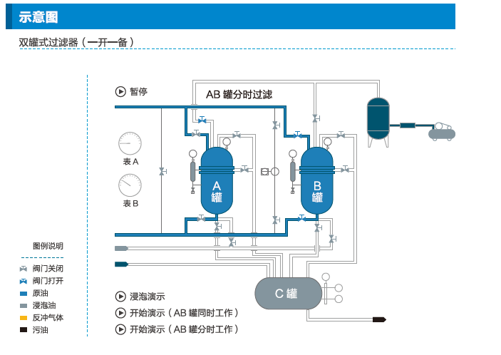 雙罐式自動反沖洗過濾器多為兩臺過濾器(A和B)并聯(lián)切換使用。正常過濾操作時,過濾器A全流量運行,過濾器B備用待機。當系統(tǒng)運行壓差(進出口壓力降)達到設(shè)定值或系統(tǒng)運行時間達到設(shè)定值時,過濾器系統(tǒng)自動投用過濾器B,將過濾器A切出過濾操作。對過濾器A進行 ??氣體 ?輔助液體反向沖洗,過濾器A反沖洗后備用。